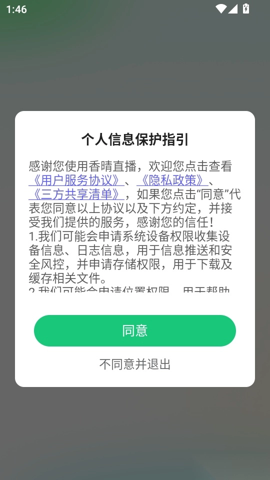 首先打开软件,阅读“个人信息保护指引”后,点击“同意”按钮即可进入。