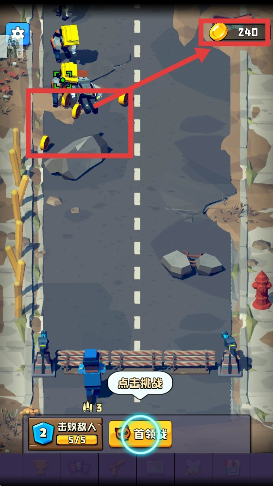 完成【击败敌人-5/5】的任务后,金币数量会增加到【240】,接下来可以点击【首领战】的入口去挑战首领,从而获得丰厚的奖励。