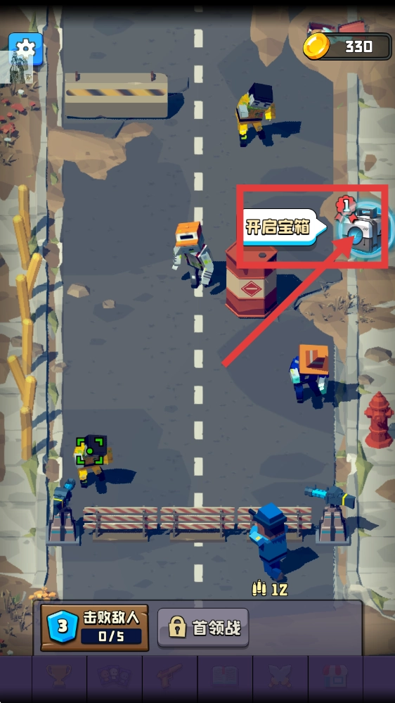 当金币数量达到【330】时,点击【开启宝箱】按钮领取奖励,与此同时会解锁新的【击败敌人-0/5】关卡,可继续推进游戏进程。