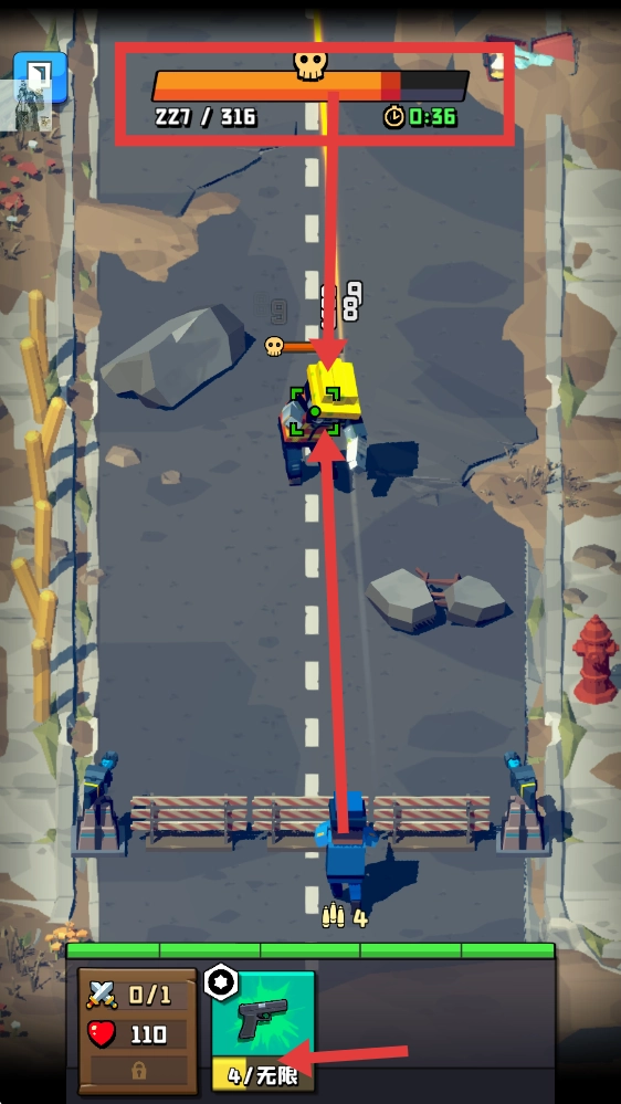首领战进行时,要留意首领的血量显示【227/316】和剩余时间【0:36】,借助【无限-手枪】展开持续攻击,力求迅速将其击败。