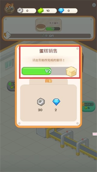 打开蛋糕销售订单后,需售出2块蛋糕方可领取奖励,所获资源可用于后续设备升级。