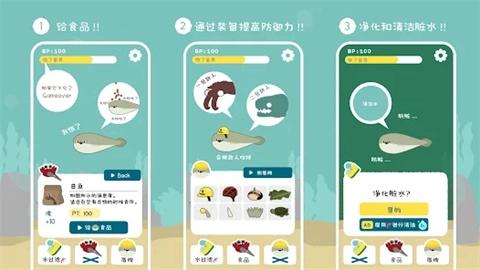 当鱼遭遇捕食者时,轻敲屏幕就能击退它们;除此之外,你还能给你的鱼配备各式各样的装备,以此提升它们的防御能力。