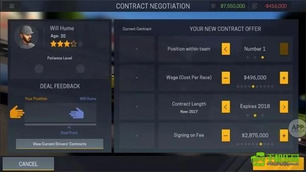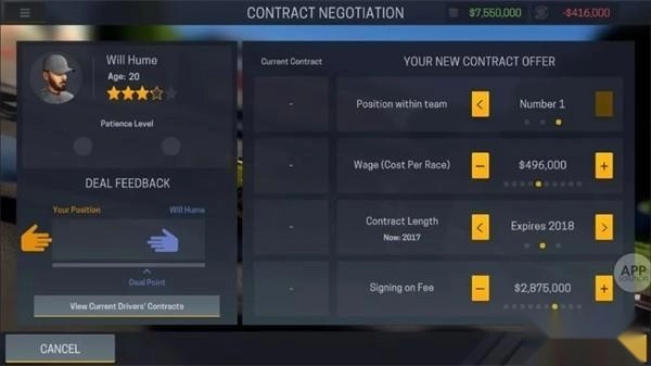 车手与工程师的签约事宜十分有意思。玩家能够掌控每一份签约合同,可随时进行解约或签约操作。但所有操作都需要支付费用,尤其是在与车手谈判时。签约的期限、签约金以及每场比赛的酬劳,都必须控制在车手能够接受且车队也负担得起的范围之内。