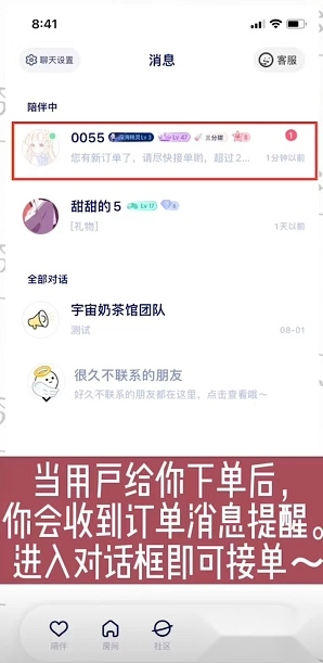 当用户向你下单后,系统会发送订单消息提醒,你只需进入对应的对话框就能完成接单操作啦~