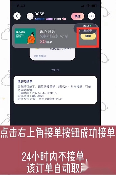 点击右上角的接单按钮即可成功接单,若24小时内未接单,该订单将自动取消。