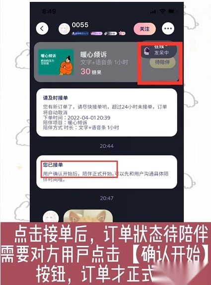 点击接单后,订单会处于待陪伴状态,需由对方用户点击【确认开始】按钮,订单才算正式启动。