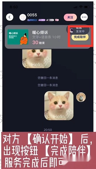 对方确认开始后,界面会显示【完成陪伴】按钮,待服务结束便可点击该按钮。