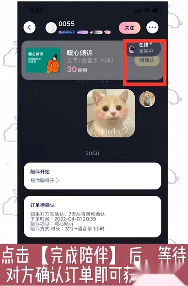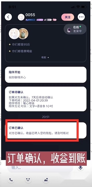 点击【完成陪伴】按钮后,只需等待对方确认订单,就能获取相应收益。