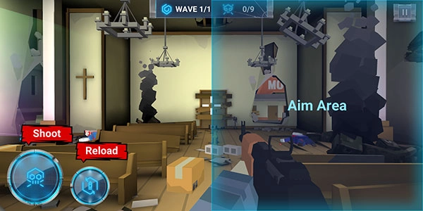 进入关卡后,在右侧屏幕通过拖动操作能够移动准星,而左侧设有开火与换弹的按钮。