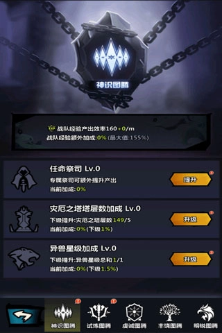另外每个图腾也别忘记单独升级,每个图腾等级分别关联了不同的玩法,比如神识图腾就需要你的灾厄之塔的层数和异兽的星级进行升级,试炼图腾则需要罪恶之都修罗场的总关卡数。