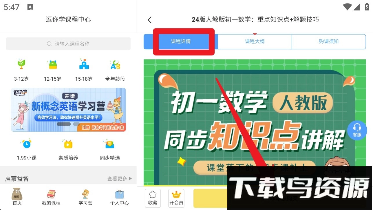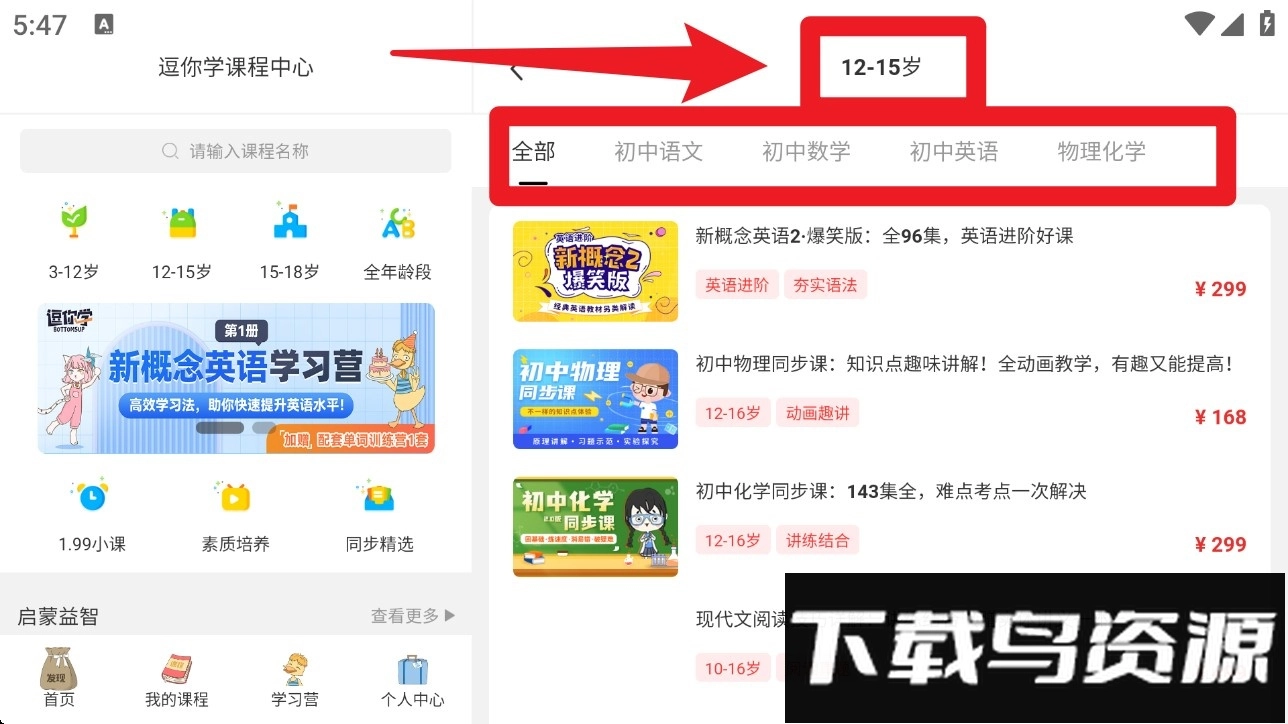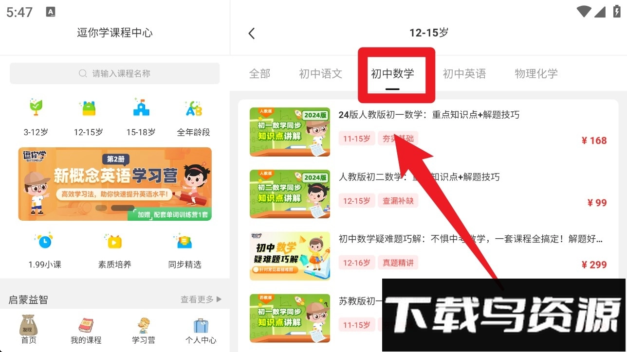 进入12至15岁专区后,可通过点击初中数学等课程分类标签,快速筛选出相关内容。