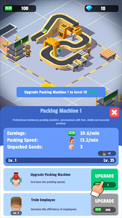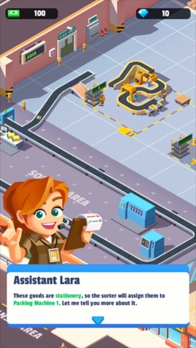 包裹经由传送带运送至分拣机,再按照品类分配到对应的打包机。现阶段初期系统仅能处理文化类物品,由1号打包机负责打包工作,每完成一件打包就能得到客户支付的费用。之后可以通过解锁与升级设备,处理更多类型的物品,拓展业务规模。