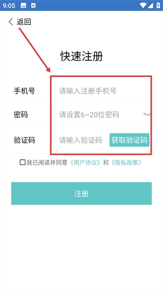 依次填写【手机号】、【密码】、【验证码】。