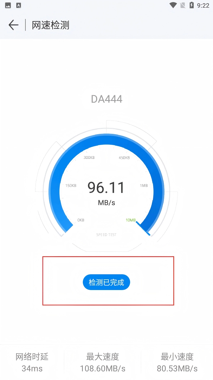 等网速检测全部结束后,屏幕上会显示【检测已完成】的提示,这时候就能查看完整的网络测速数据啦。