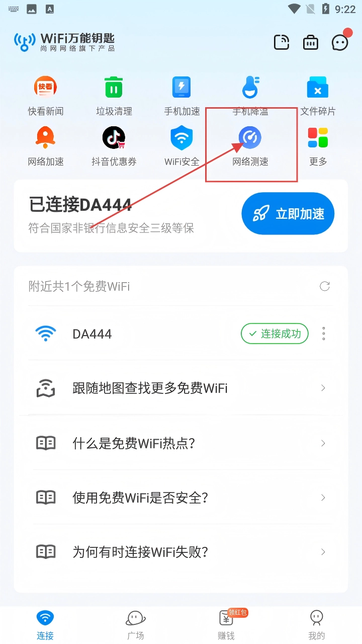 在WiFi万能钥匙的主界面里,找到【网络测速】这个功能入口并点击它,就可以启动测速流程了。