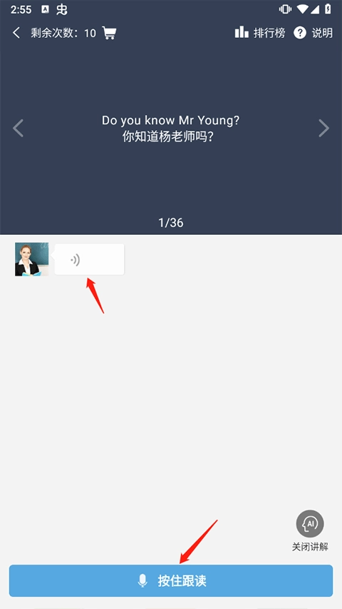可以先点击听一遍,再按着下方的按钮点击跟读一遍。