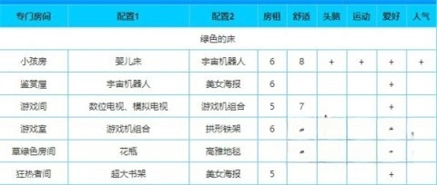 这样的设计思路是:叠加房和卫生间属于游戏初期即可获取的资源,而橙色床的加入能让后续游戏进程实现突破(前提是前期快适排名达到第一),厨房区域的设施同样可以尽早解锁。至于绿色床(需满足全国快适排名第一的条件)所需的婴儿床,能有效提升快适度;同时,电视机与游戏机这类组合设施也可在游戏中期获取。居民通过频繁使用这些设施,还能逐步提升设施等级,进而提高基础快适度。
