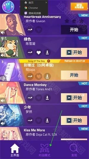 1、玩家进入游戏后先将教程阶段的游戏玩一下,不玩这个阶段的游戏无法进入正式的游戏界面。用户进入正式的游戏界面后(如下图所示)就可以点击底部导航栏中的【对战模式】(下图绿色箭头所指)