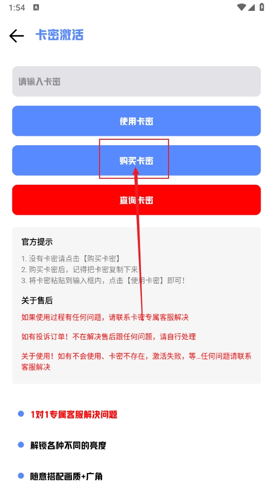 最后进入卡密页面,点击“购买卡密”,按照提示完成购买操作就可以了。