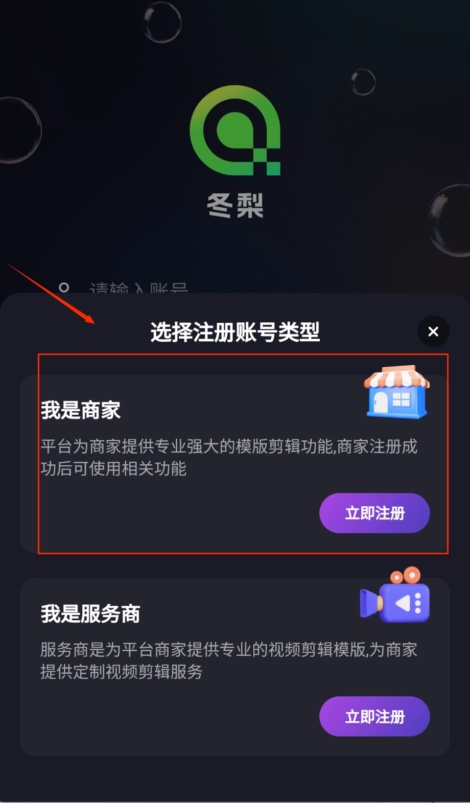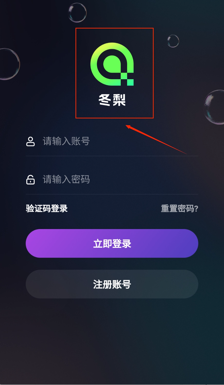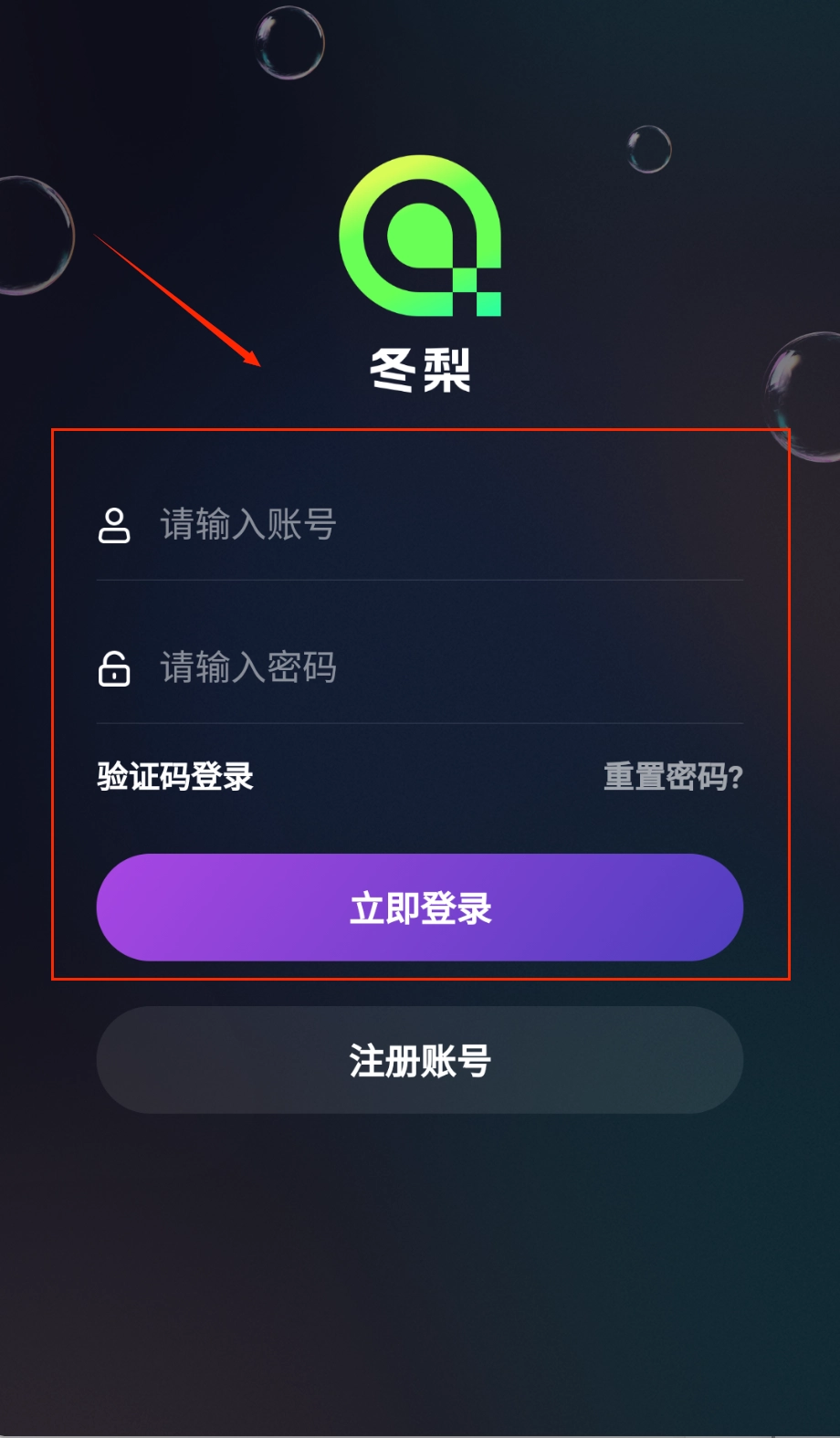 打开软件后,醒目的“冬梨”logo和深色渐变背景便映入眼帘,点击注册账号按钮即可开始填写信息,整体界面设计十分清爽。
