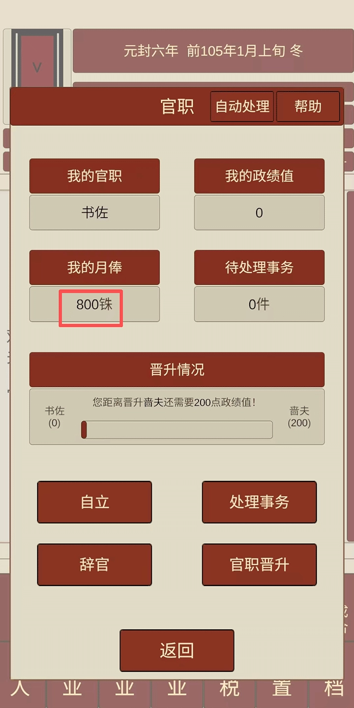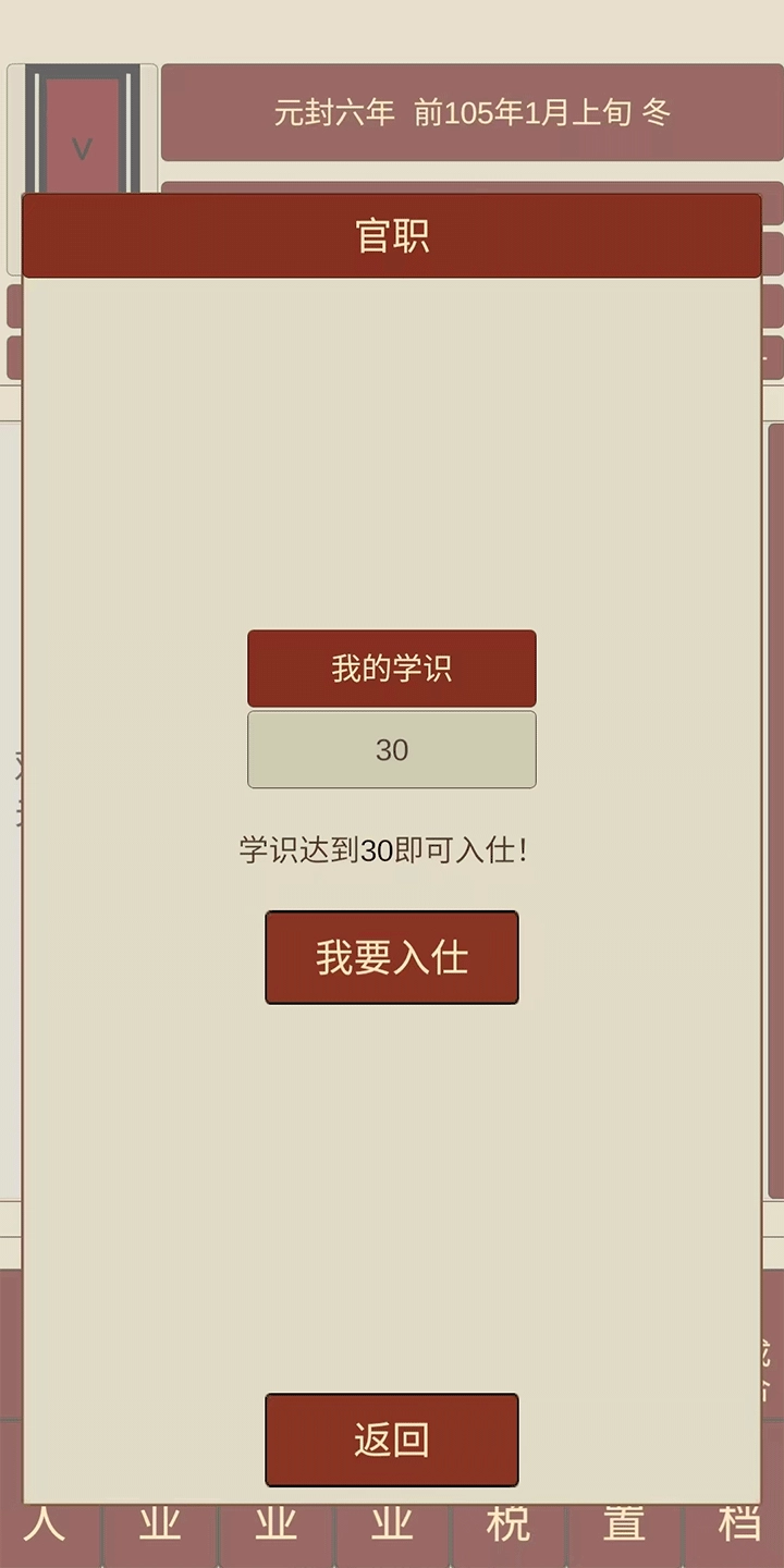 当学识值满30点时,便能顺利踏入仕途,初始月俸为800,这笔收入足以维持家庭开销,不必再花费时间打理农田或从事副业。