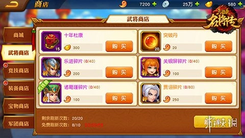 在武将商店里,玩家能够买到各个阵营紫色及以上品质的武将碎片与完整武将卡片。