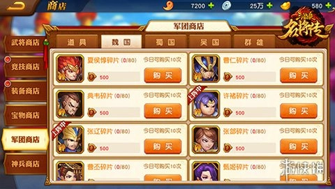 竞技场商店、装备商店、神兵商店和军团商店里,玩家也能买到橙色品质的武将碎片。