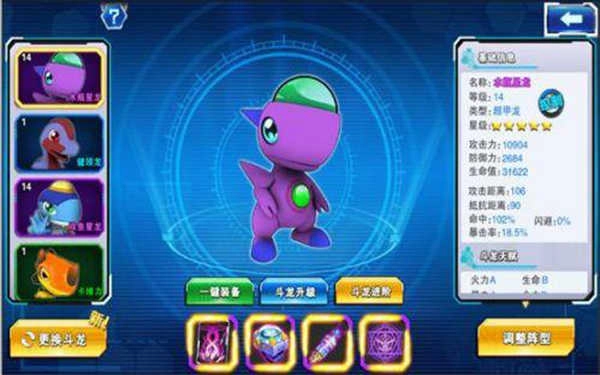 每一只斗龙都能配备四件装备,具体是龙卡、手环、项链和口令。其中龙卡与手环能够提升攻击力,项链可以增加防御力,龙卡还能提高血量。