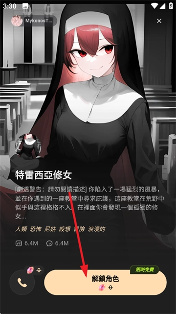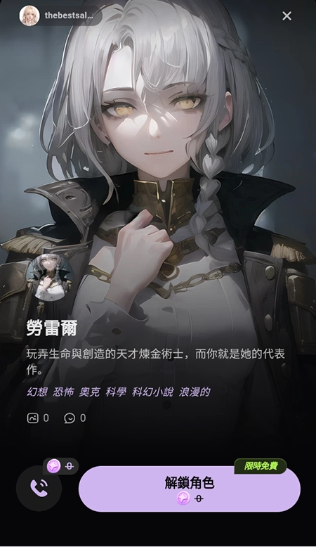 首先查看角色详情页,了解角色设定后,点击“解锁角色”按钮即可获取该角色。