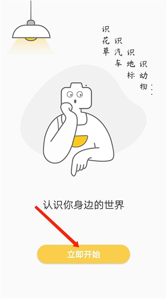 打开智慧识物应用后,进入其主界面,能看到界面上显示着“识花草”“识汽车”“识地标”“识动物”等功能说明,此时只需选择【立即开始】选项即可。