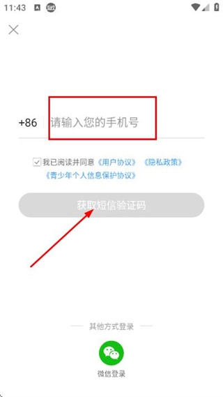 在登录页面输入手机号,勾选相关协议后,点击获取验证码按钮。
