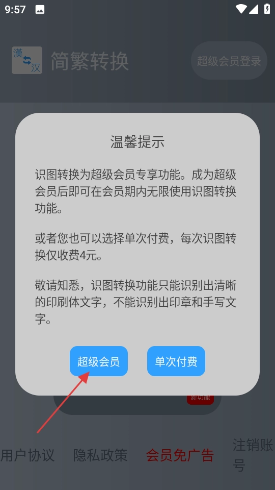 3、触发识图转换,弹出提示,可选超级会员或单次付费,了解功能限制后选择。