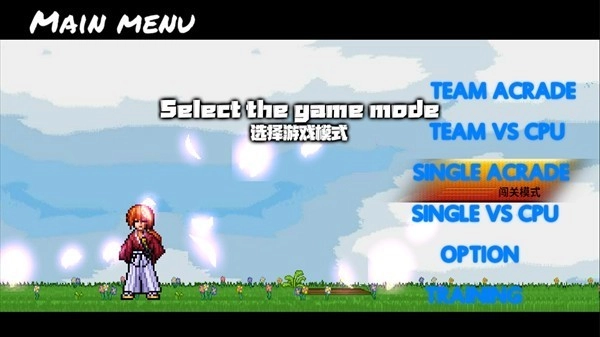 打开游戏后,只需点击屏幕就能进入主界面。这里总共设有6个主要选项,初始显示语言为英文,若想切换成中文说明,直接点击对应选项进行设置即可。前两个标有“TEAM”的选项和后两个标有“SINGLE”的选项存在明显区别:选择“TEAM”模式时,玩家需要挑选3名不同的角色,并且可以自主调整他们的出场顺序;而“SINGLE”模式则更为简单,仅需选择一个角色就能开始游戏。现在,我们先点击第三个单人闯关模式选项,接着再次点击以确认选择。