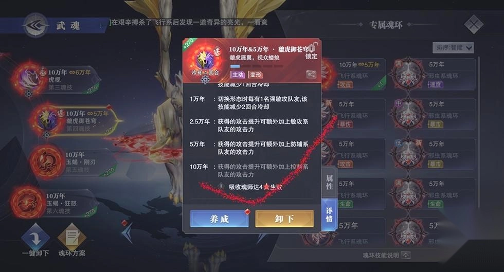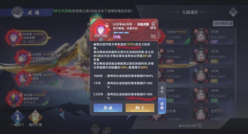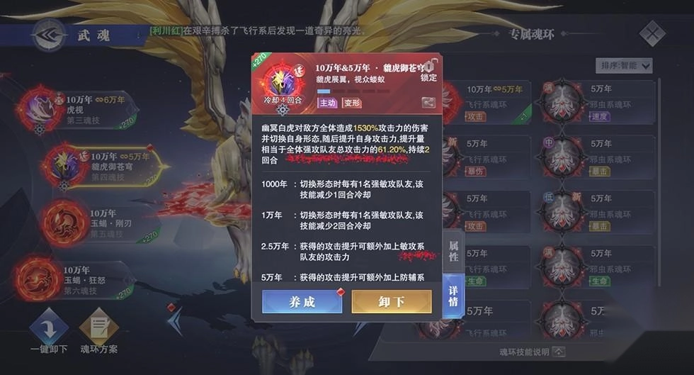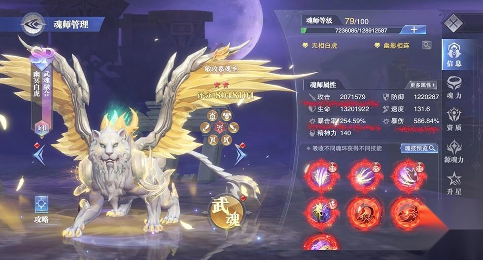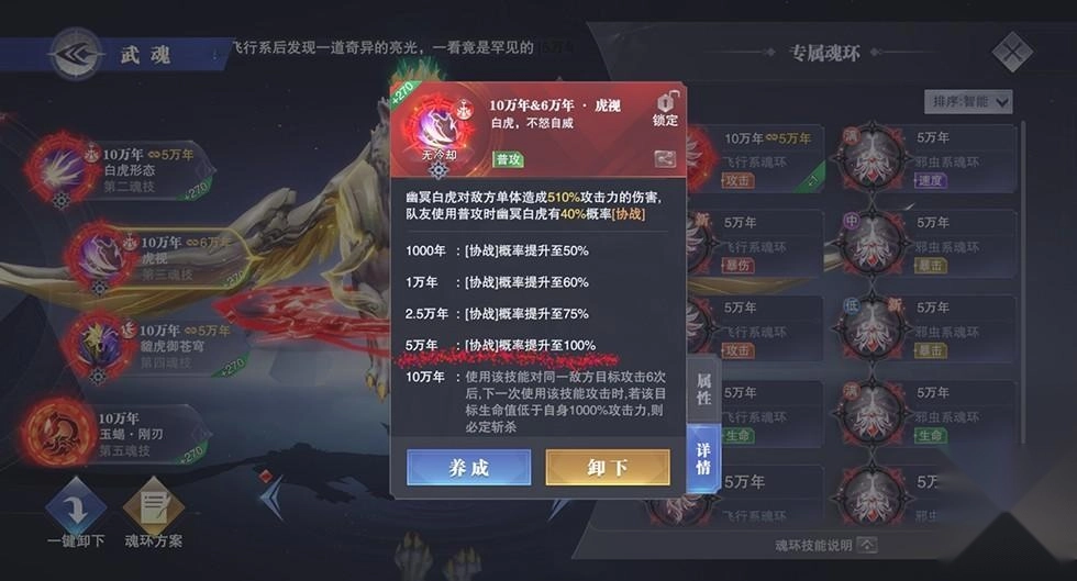 再看第二魂技,不管是处于白虎状态还是幽冥状态,提升暴击率都相当划算。所以我们选择魂环时基本以暴击率为核心,属性加点方面也主要倾向于暴击率。