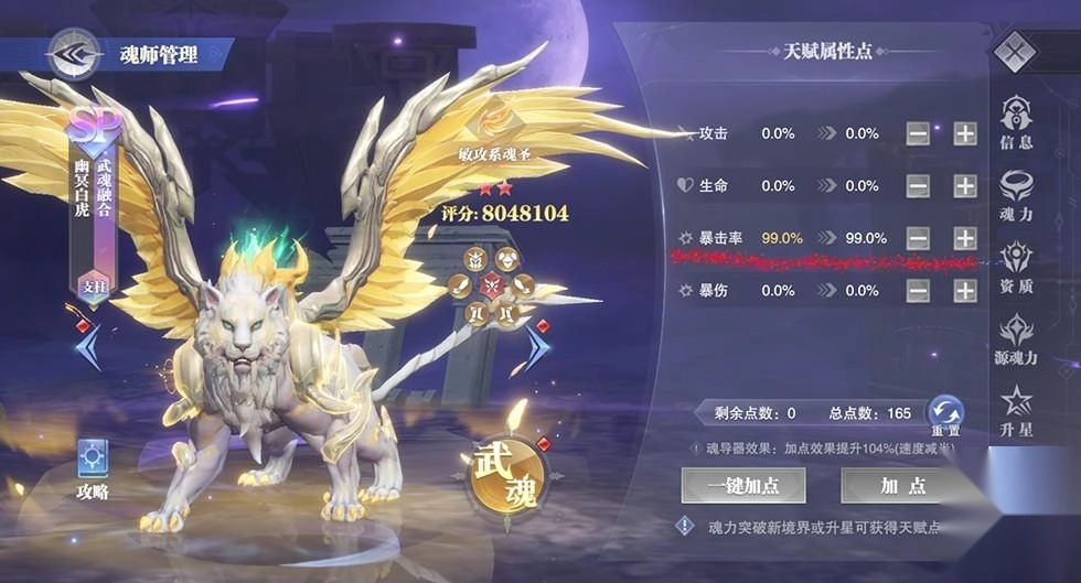 再来看幽冥白虎的加点,毫无疑问,全部加暴击率效果会更好。