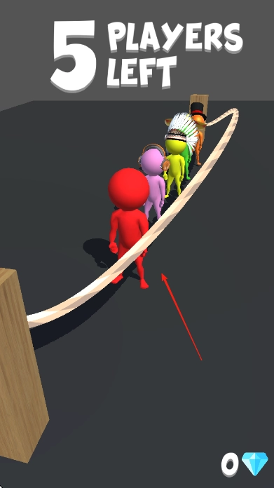 1、游戏开始,操控红色火柴人在绳索上前进,留意屏幕上方【PLAYERSLEFT】显示剩余玩家数量,像初始显示【5PLAYERSLEFT】。