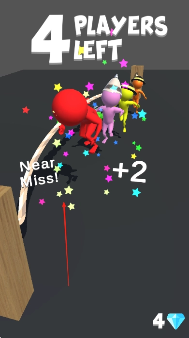 2、游戏时,绳子会晃动,红色火柴人需要跳过绳索,成功跳过绳索可获钻石奖励,如图显示【NearMiss!】和【+2】。