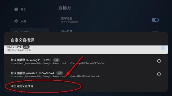 接下来就能切换不同的直播源了,目前系统自带三个,默认选用第一个;要是想更换源,直接点击“添加自定义直播源”就行。