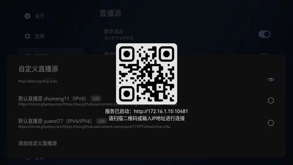 你可以用手机扫描对应的二维码,也能在手机浏览器里输入指定的IP地址来完成连接,等连接成功之后,把直播源导入进去就可以正常使用了。