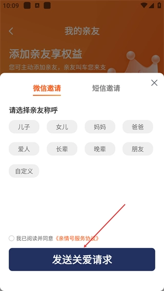 在选定亲友称呼后,勾选相关协议并点击【发送关爱请求】按钮,即可完成邀请操作。