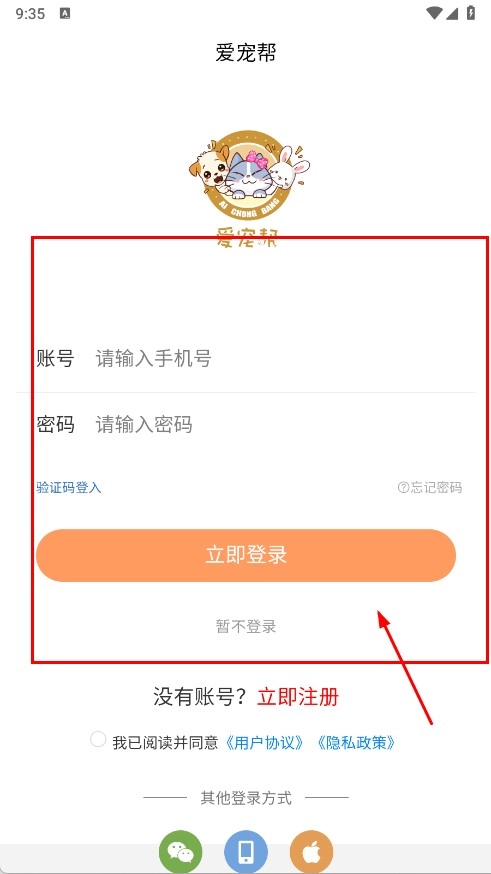 1. 开启爱宠帮,于登录页面填写手机号与密码,点击“立即登录”;若不想登录,也可选择“暂不登录”,以此体验部分功能。