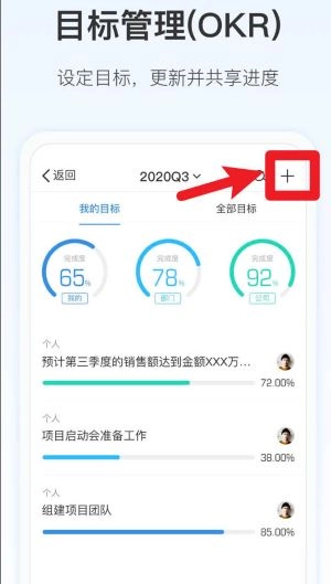 1. 于目标管理界面,点击右上角的加号,就能新增季度目标。完成填写后,系统会自动记录,并展示完成进度。