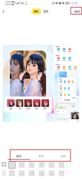 在拼图编辑页面里,挑选适配的版式、背景和边框,完成相关设置后点击保存按钮;保存好的照片能够在手机相册中进行查看。