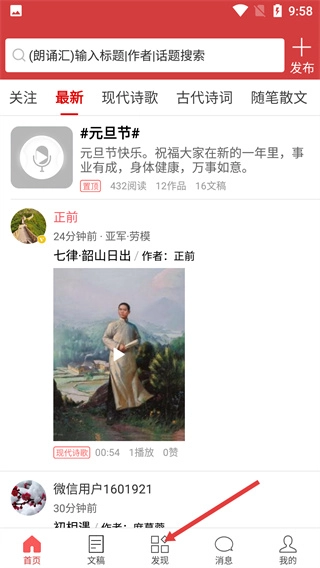 当您在展示各类作品的首页时,点击底部导航栏中的【发现】按钮,即可进入包含功能分类的发现页面。