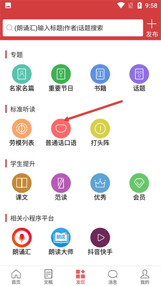 在发现页面的【标准听读】板块中,点击【普通话口语】选项,即可进入普通话口语评测页面。