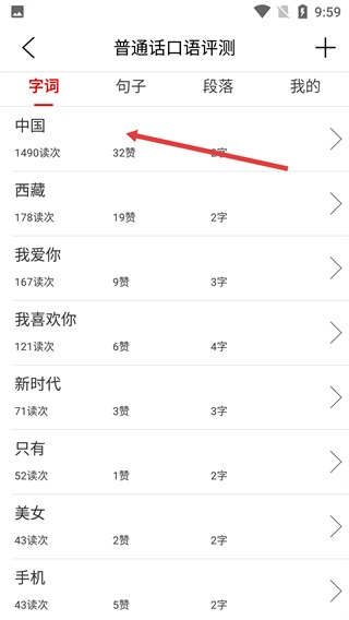 进入普通话口语评测页面后,在【字词】分类列表里,找到并点击【中国】这个字词条目,就能进入详情页了。