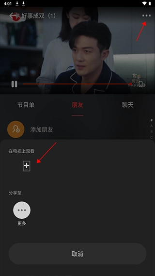 直播时,点击画面右上角的扩展功能图标,接着选择并点击【在电视上观看】选项,就能完成投屏观看操作。