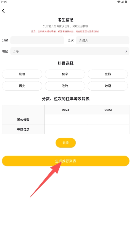 在填报界面输入信息并使用“生成推荐列表”按钮。