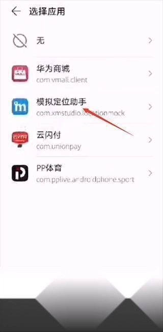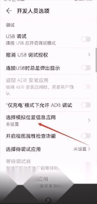 点击蓝色字体打开已开启的开发者模式菜单,找到模拟位置应用选择选项,选中当前软件。