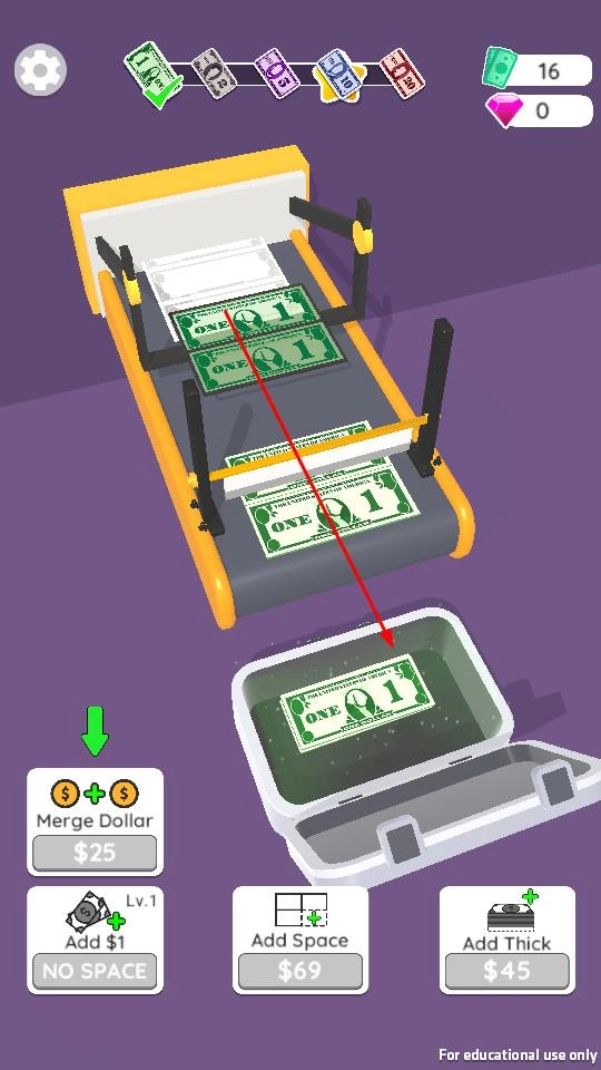1. 通过消耗金币来解锁增钞、扩大空间以及增厚功能,同时对传送带产钞进行升级。